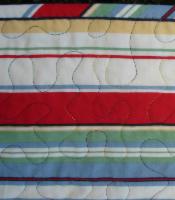 | “A Transport of Delight” ~ December 2009 ~ Here was an interesting commission. My client had already bought two bolts of fabric; one which had lovely whimsical images of planes, trains and automobiles, as well as boats, buses and bicycles in bright and cheerful colors intended for the front. The other fabric matched in colors and was a delightfully soft flannel in a merry stripe for the back. The idea was to match the print on the transport fabric as near to the selvedges as possible, a bit like matching wallpaper, plus match the stripes on the flannel for the back of the quilt. I used a clever tchnique shown to me by a quilting buddy and the matching was near perfect! Friends that visited when I had it loaded on my frame struggled to see the join both on the front and back! I suggested that the flannel be used again for the binding (around the edge), plus making it a little wider than usual, and then my client suggested putting the stripe at an 45 degree angle (see below) which worked really well. | Back